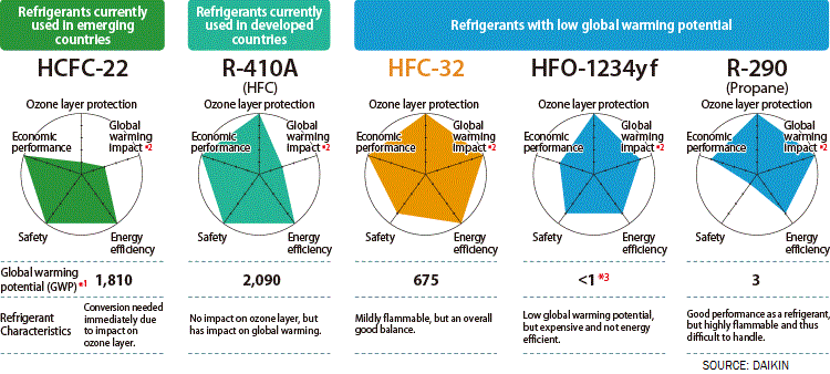 Is R-32 the next generation of refrigerants that we will employ in the coming years? With a substantial improvement over R410A (R32 GWP = 675, R410A GWP = 2088) in its impact on the environment, we could say it would be the commercial refrigerant of next decade. Beside that, R-32 is 10% more cheap than R410A, lowest toxicity and flammability. See this interesting article from DAIKIN (see more)