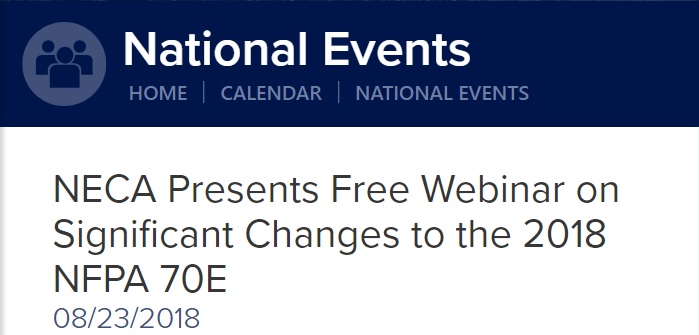 National Electrical Contractors Association says: «NECA Premier Partner Schneider Electric along with NECA’s subject matter experts will present a webinar on the significant changes in the 2018 edition of NFPA 70E, The Standard for Electrical Safety in the Workplace. NFPA 70E Technical committee members will discuss some of the new changes and answer questions that were submitted by attendees at the 2018 NECA Safety Professionals Conference for clarification. Keeping up with the latest rules and guidelines for electrical work is critical for those in the industry. By attending and participating in this webinar, attendees will be able to gain knowledge of the terms and updated requirements in this latest revised edition»