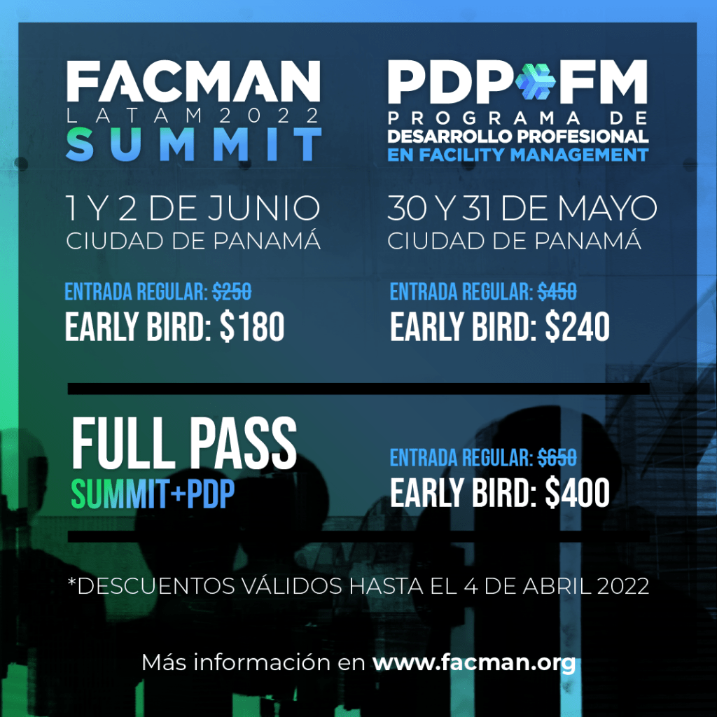 Estamos a pocos días de cerrarse el plazo para obtener el descuento y acceder con un precio preferencial a las dos actividades: al FACMAN LATAM 2022 SUMMIT y al Programa de Desarrollo Profecional PDP FM, a desarrollarse durante el evento FACMAN LATAM 2022 organizado por APAFAM (Asociación Panameña de Facility Management) y por 3g office.
