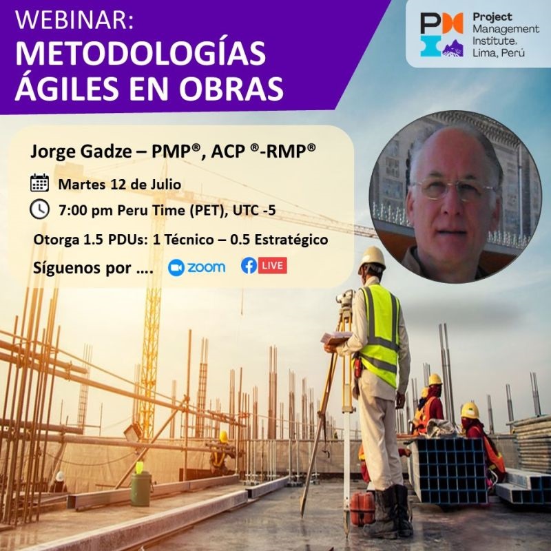 Este martes 12 de Julio, 2022 desde las 19.00 hrs. (PET) (UTC -5) se desarrollará el webinar denominado: «Metodologías ágiles en Obras» presentado por el Capítulo PMI Lima Perú.