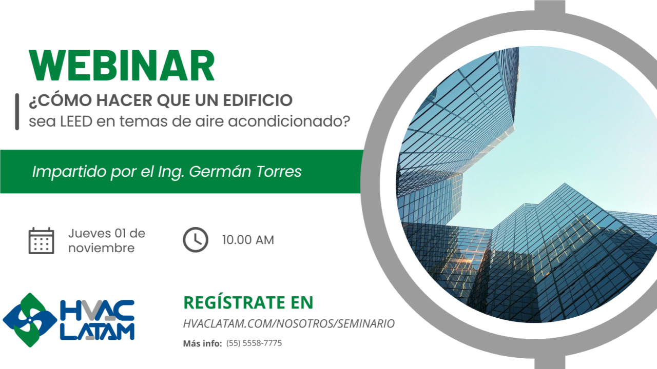 Este Jueves, 01 de Diciembre, 2022 desde las 10.00 Hrs. (Hora México) se estará desarrollando el seminario web: «¿Como hacer que un Edificio sea LEED en temas de Aire Acondicionado?» organizado por HVAC Latam.