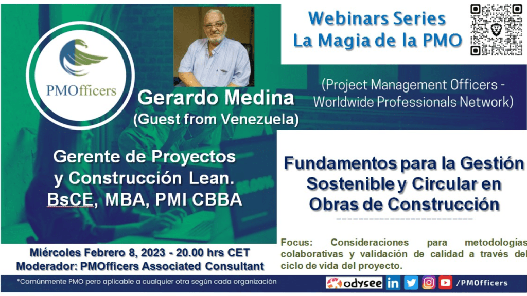 Este 08 de Febrero, 2023 desde las 8.00 pm (CET) se estará desarrollando el webinar: «Fundamentos para la Gestión Sostenible y Circular en Obras de Construcción» presentado por PMOXperience