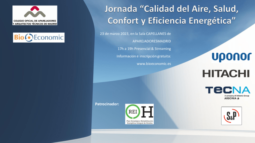 Este 23 de Marzo, 2023 desde las 17:00 hrs. (Hora Madrid) se estará desarrollando la Jornada «Calidad del Aire, Salud, Confort y Eficiencia Energética» presentado por el Colegio Oficial de Aparejadores y Arquitectos Técnicos de Madrid y BioEconomic
