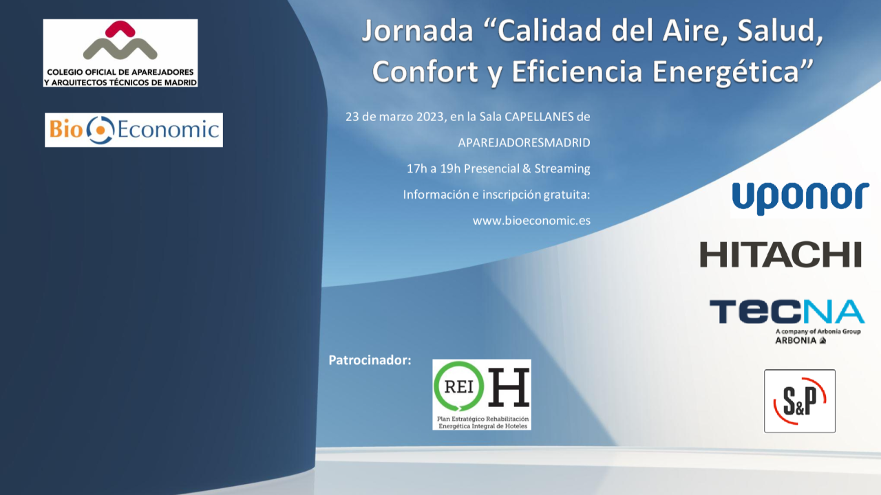 «El 23 de marzo el Colegio Oficial de Aparejadores y Arquitectos Técnicos de Madrid – APAREJADORESMADRID y BioEconomic, organizan la Jornada “Calidad del Aire, Salud, Confort y Eficiencia Energética”. Se presentarán soluciones técnicas, casos prácticos, de éxito ya aplicados en la calidad del aire interior, sus certificaciones y las soluciones más eficientes energéticamente. Tendrá lugar a las 17h en el Colegio Oficial de Aparejadores y Arquitectos Técnicos de Madrid – APAREJADORESMADRID, en la Sala CAPELLANES con acceso directo a la terraza, donde tendrá lugar el catering / networking. La retransmisión vía streaming se realizará mediante el canal de YouTube de BioEconomic».