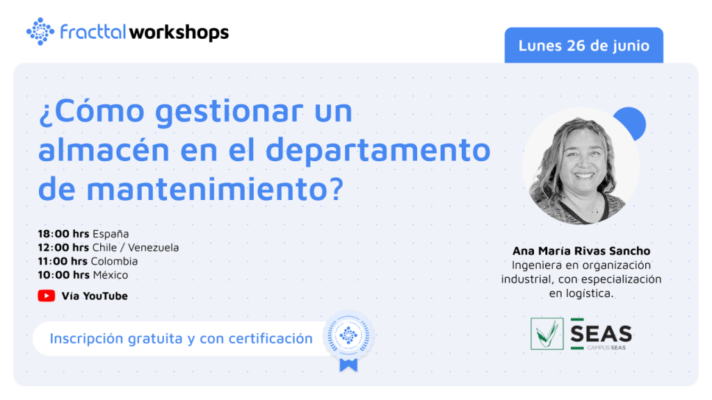 Este lunes 26 de junio, 2023 desde las 11.00 hrs. (GMT-5) se estará desarrollando el seminario web: «¿Cómo gestionar un almacén en el departamento de mantenimiento?» presentado por Fracttal