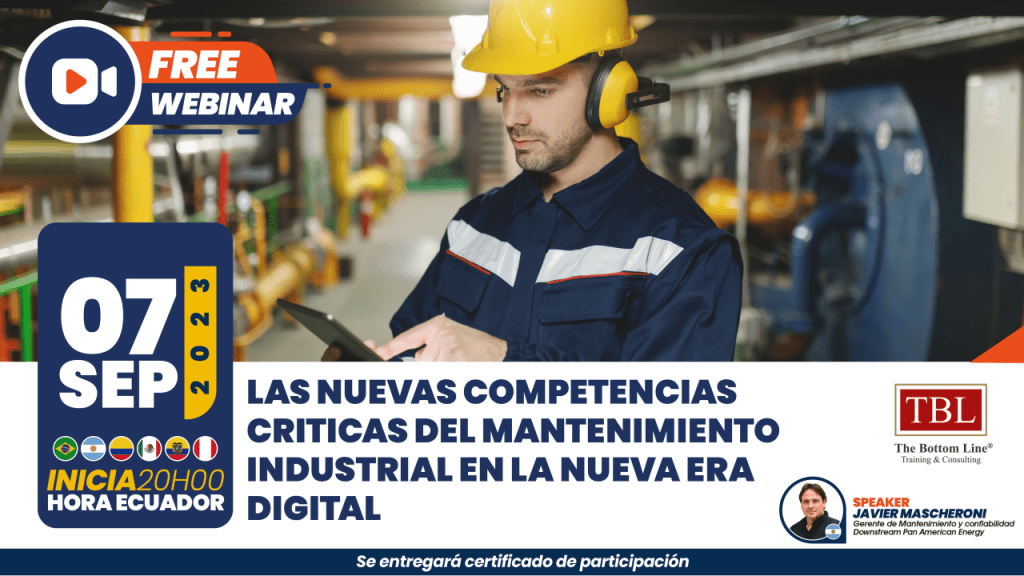 Este jueves 7 de septiembre, 2023, desde las 20:00hrs. se estará desarrollando el webinar: «Las nuevas competencias críticas del mantenimiento industrial» a cargo de TBL The Bottom Line®