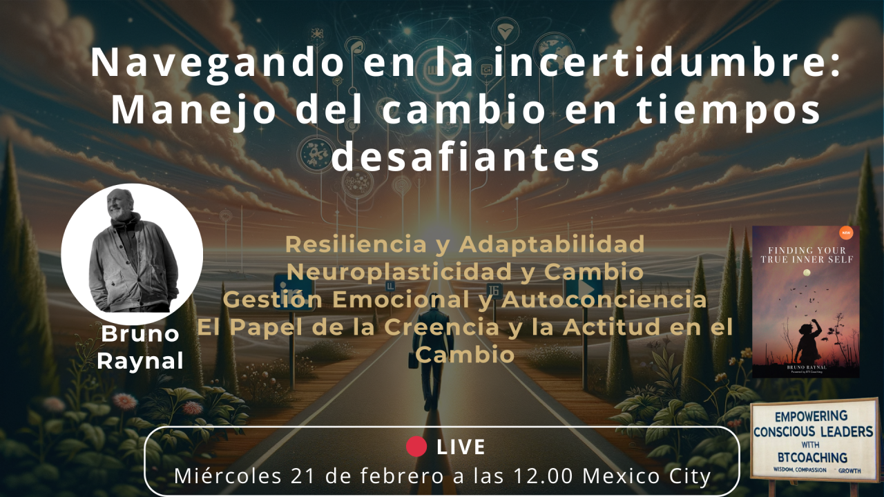 «El Cambio y sus Retos: Descubre cómo la adaptabilidad y la autoconciencia pueden revolucionar tu enfoque del liderazgo. Inicia 2024 con nuestro webinar de transformación y autoconocimiento. Descubre estrategias integrales para adaptarte al cambio, uniendo filosofía, neurociencia y psicología»