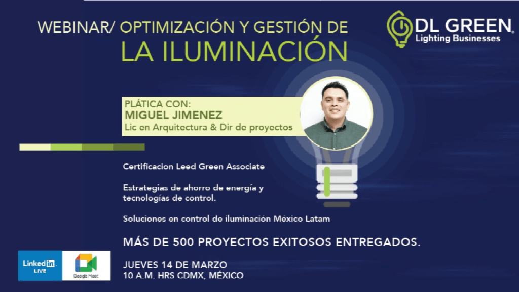 Te invitamos cordialmente al seminario web titulado «Optimización y gestión de la iluminación», presentado por DL GREEN, programado para el jueves 14 de marzo de 2024, a partir de las 10:00 hrs. (GMT-5). Este evento proporcionará conocimientos prácticos y soluciones innovadoras para optimizar la eficiencia energética en el ámbito de la iluminación, en consonancia con los principios de sostenibilidad y desarrollo responsable.
