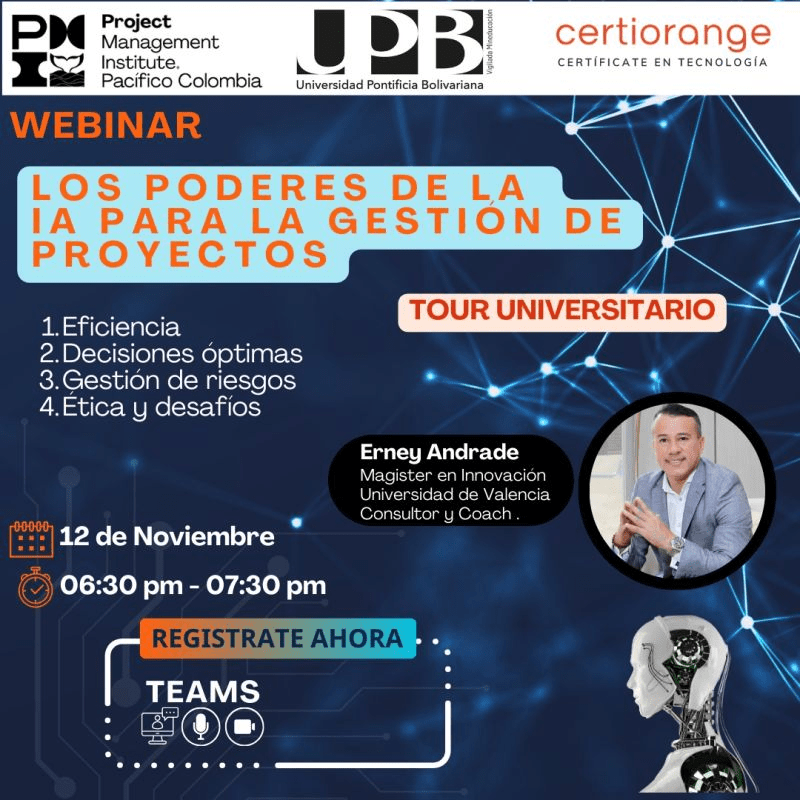 Este 12 de noviembre de 2024, desde las 18:30 hrs (GMT-5), se estará desarrollando el seminario web: “Los poderes de la IA en la Gestión de Proyectos” organizado por el Capitulo PMI Pacifico Colombia.