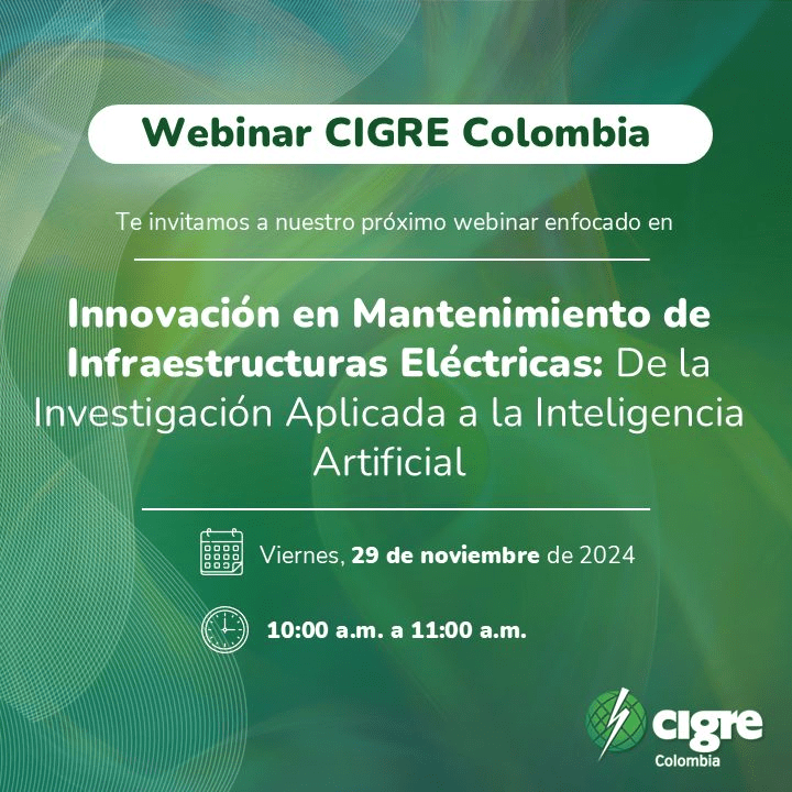 Este 29 de noviembre, 2024, desde las 10:00 hrs (GMT-5) se estará desarrollando el seminario web: «Innovación en Mantenimiento de Infraestructuras Eléctricas: De la Investigación Aplicada a la Inteligencia Artificial» desarrollado por CIGRE Colombia.