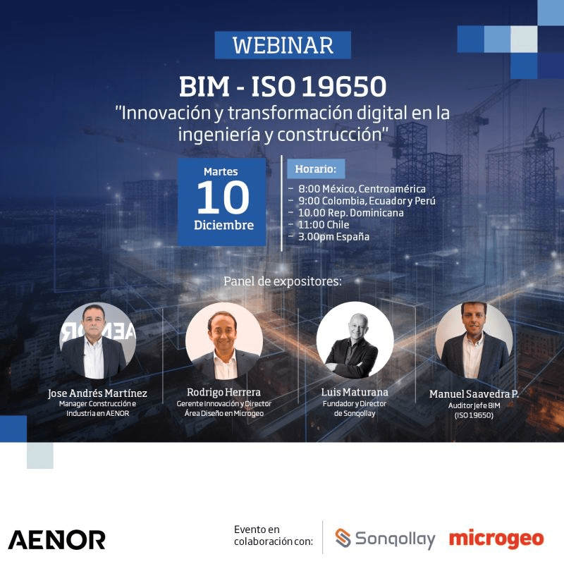 Este 10 de diciembre, 2024 desde las 09:00 hrs (GMT-5) se estará desarrollando el seminario web: “BIM – ISO 19650: Innovación y transformación digital en la ingeniería y construcción” organizado por AENOR Chile.