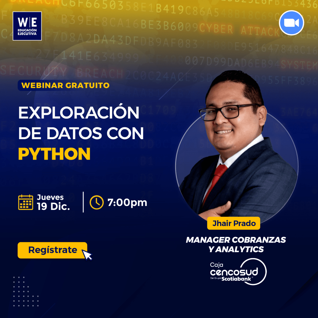 Este 19 de diciembre, 2024 desde las 19:00 hrs (GMT-5) se estará desarrollando el seminario web: “Exploración de datos con Python” desarrollado por WE Educación Ejecutiva.