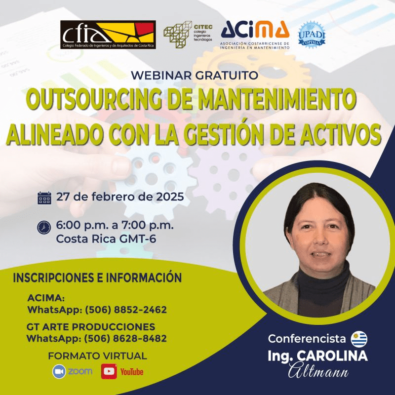 Este 27 de febrero, 2025 desde las 18:00 hrs (GMT-5) se estará desarrollando el seminario web: «Outsourcing de mantenimiento alineado con la gestión de activos» desarrollado por la Asociación Costarricense de Ingeniería en Mantenimiento (ACIMA).