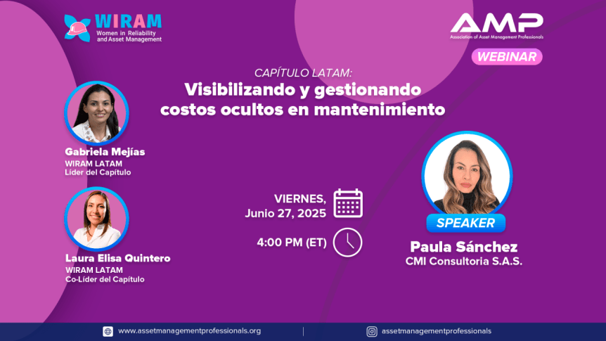 Este 27 de junio, desde las 15:00 hrs (GMT‑5), no te pierdas el webinar “Visibilizando y Gestionando Costos Ocultos en Mantenimiento” organizado por la Association of Asset Management Professionals y el capítulo WIRAM LATAM.
