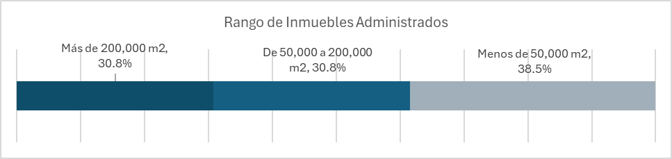 El tamaño de los inmuebles administrados reveló que el 38.5% de los encuestados gestiona espacios menores a 50,000 m², un 30.8% maneja instalaciones entre 50,000 y 200,000 m², y el 30.8% supera los 200,000 m². Esta distribución indica que la muestra incluyó tanto a organizaciones con infraestructuras compactas (como pequeñas sedes bancarias o tiendas minoristas) como a aquellas con operaciones a gran escala (como plantas industriales o centros/almacenes comerciales).