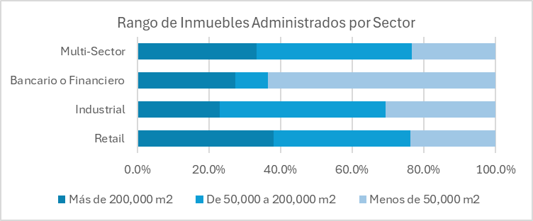 El 76.2% de los profesionales que administran inmuebles Retail, mencionó que las áreas gestionadas (centros/almacenes comerciales, tiendas por departamento, cadena de tiendas) superaban los 50,000m2. La mitad de ellos, inclusive superaban los 200,000m2. El 76.2% de los profesionales dedicados al sector Industrial indicaron que administraban instalaciones (industrias manufactureras, fábricas) con un área menos a 200,000m2, mientras que el 63.6% de los profesionales del sector Bancario o Financiero, indicaron que administraban un portafolio de inmuebles (agencias bancarias, financieras) que no superaban los 50,000m2.