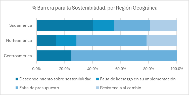 Mención especial lo tienen Paraguay y Venezuela quienes particularmente señalar a la resistencia al cambio como principal barrera para la sostenibilidad. Estas variaciones geográficas subrayan la importancia de adaptar las estrategias de sostenibilidad a contextos locales específicos.