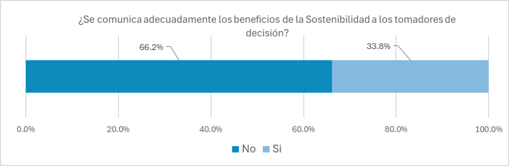 Uno de los hallazgos más relevantes es la brecha en la comunicación de los beneficios de la sostenibilidad a los tomadores de decisiones, con un 66.2% de los encuestados indicando que estos no se transmiten adecuadamente.