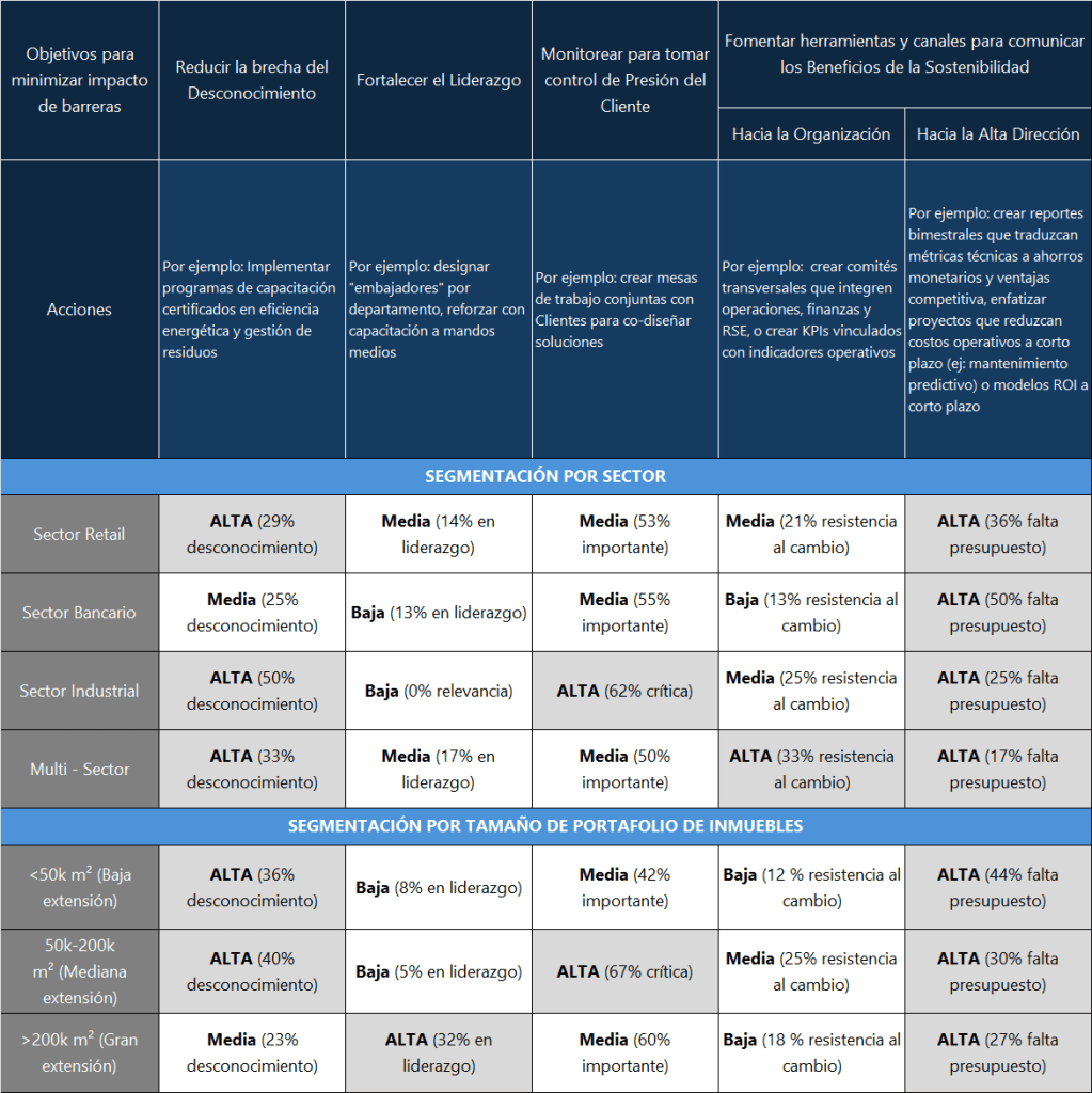 Esta matriz aprovecha todos los hallazgos del estudio, convirtiendo barreras en acciones concretas segmentadas por sector y tamaño, asegurando que el facility manager lidere una transición sostenible realista y efectiva.