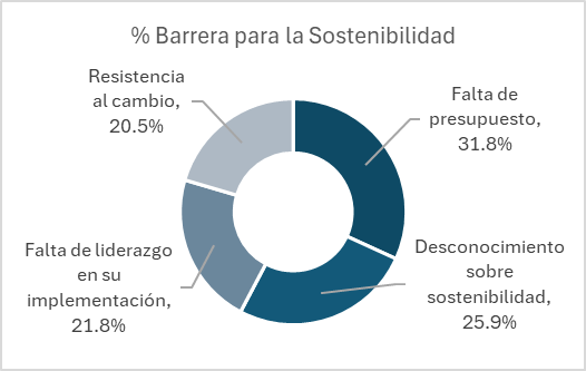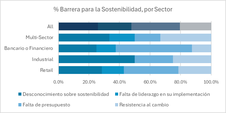 Al analizar los resultados por sector económico, emergieron diferencias notables en las barreras percibidas. El sector retail distribuye su preocupación en dos aspectos: a la falta de presupuesto (35.7%) y a la vez por el desconocimiento sobre sostenibilidad (28.6%). En contraste, el sector bancario y financiero identificó la falta de presupuesto como obstáculo principal (50%), posiblemente debido a estrictos controles de gastos y procesos burocráticos de aprobación de inversiones.