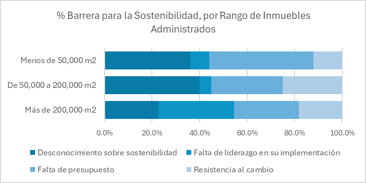 En el caso de portafolio de inmuebles grandes (>200,000 m²) la falta de liderazgo (31.8%) y la falta de presupuesto (27.3%) superaron a las limitaciones presupuestarias (30%), sugiriendo que en operaciones extensas, los factores organizacionales tienden a desarrollar más restricciones financieras.