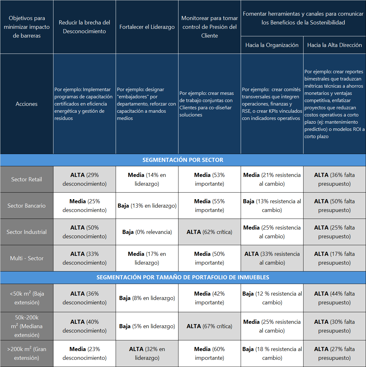 Esta matriz aprovecha todos los hallazgos del estudio, convirtiendo barreras en acciones concretas segmentadas por sector y tamaño, asegurando que el facility manager lidere una transición sostenible realista y efectiva.