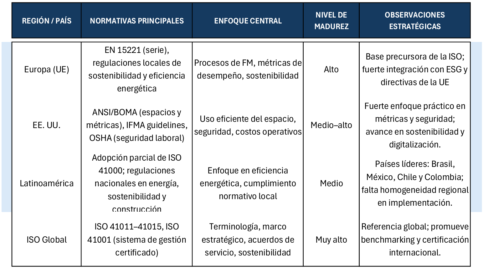 El Facility Management (FM) ha evolucionado desde ser una disciplina operativa hacia una función estratégica que responde a exigencias crecientes en sostenibilidad, eficiencia, integridad en cadena de suministro, transparencia y regulación, entre otros elementos. En los últimos años, normas internacionales como la serie ISO 41000, la norma europea EN 15221, estándares ANSI/BOMA, y regulaciones ESG han pasado de ser buenas prácticas voluntarias a componentes centrales de la normatividad aplicable, especialmente en Europa Occidental. En Latinoamérica, aunque el proceso es más heterogéneo, se observa un aumento en la adopción de estas normas, así como una presión regulatoria cada vez mayor.