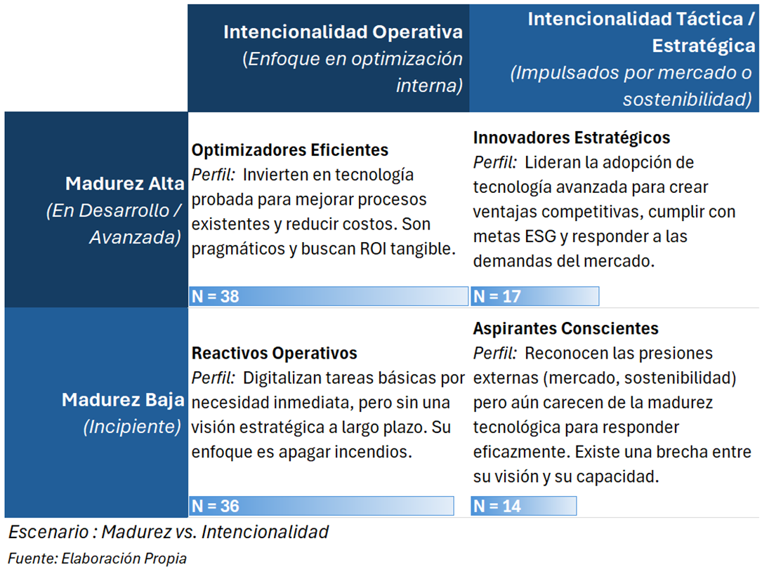 En el eje vertical (madurez tecnológica), se representa el grado de desarrollo en la adopción y uso de tecnologías digitales, desde etapas iniciales hasta niveles avanzados. En el eje horizontal (intencionalidad), se sitúa la motivación principal que guía la transformación digital: desde enfoques centrados en la optimización interna y la eficiencia operativa, hasta estrategias orientadas a la innovación, la sostenibilidad o la respuesta a demandas externas como las del mercado o los criterios ESG. Al combinar ambos ejes, se generan cuatro cuadrantes que reflejan distintos arquetipos organizacionales.
