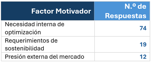 - La Optimización Interna como Motor Principal: La principal motivación para invertir en tecnología no es la presión del mercado, sino la «necesidad interna de optimización» (mencionada por el 70% de los participantes), lo que subraya un enfoque en la eficiencia operativa y la reducción de costos.