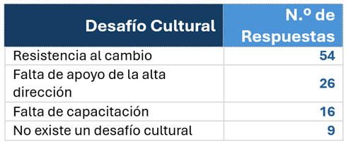 - La Resistencia al Cambio como Barrera Principal: El factor humano se confirma como el mayor obstáculo. El 51% de los encuestados identifica la «resistencia al cambio» como la principal barrera cultural, superando la falta de presupuesto o de apoyo directivo.