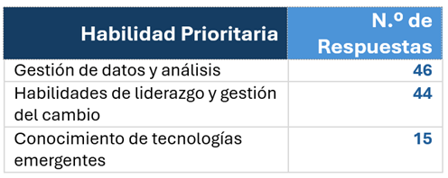 Para superar las barreras y capitalizar los motivadores, se requieren nuevas competencias. Los encuestados priorizan las habilidades de análisis de datos y de gestión sobre el conocimiento técnico puro.