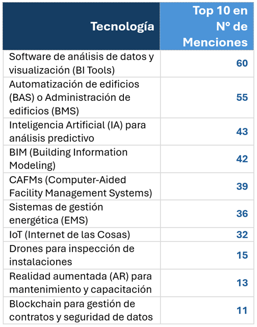 - El Auge del Análisis de Datos: Las herramientas de software para el análisis y visualización de datos (BI Tools) son percibidas como la tecnología de mayor impacto (60 menciones), por encima de sistemas más tradicionales como los CAFMs, evidenciando una transición hacia una toma de decisiones basada en datos.