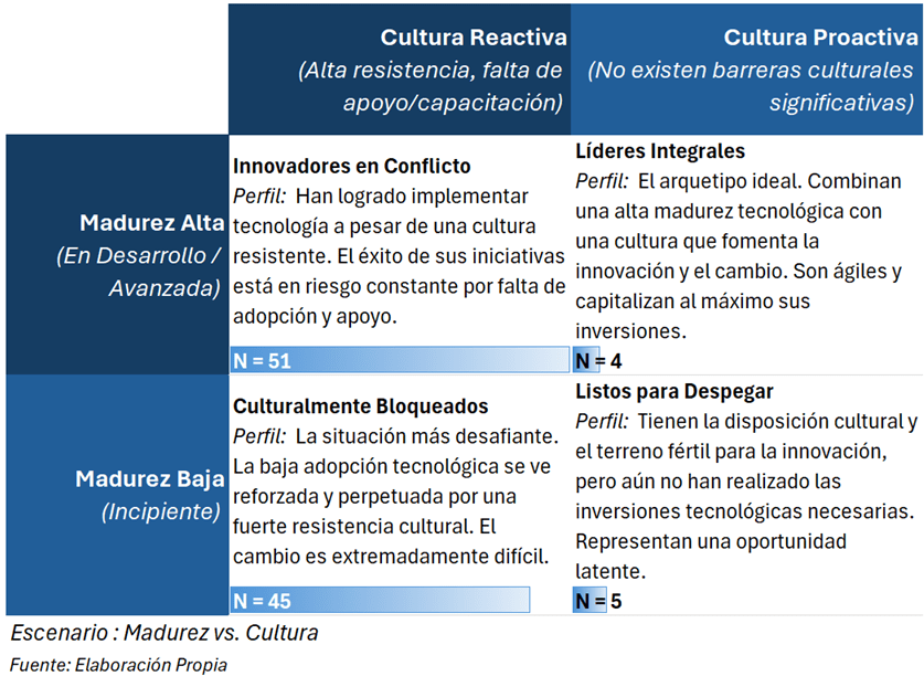 El eje vertical representa el grado de adopción y sofisticación tecnológica, mientras que el eje horizontal refleja el nivel de apertura cultural, desde una cultura reactiva —caracterizada por la resistencia al cambio y la falta de apoyo o capacitación— hasta una cultura plenamente proactiva, donde no existen barreras culturales significativas. El análisis visual permite identificar en qué cuadrante se sitúa cada grupo, ayudando a comprender si los retos principales son tecnológicos, culturales, o una combinación de ambos.