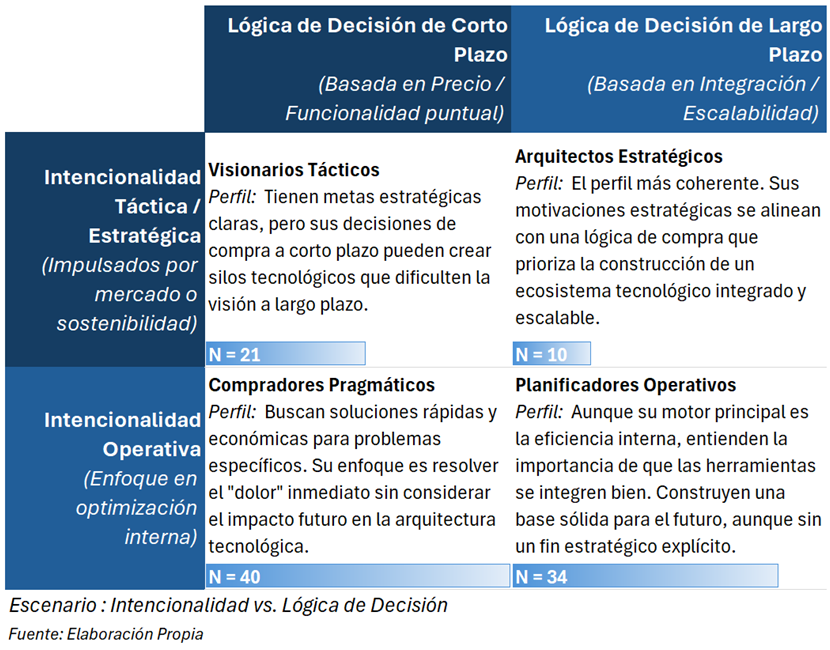 El eje horizontal distingue dos enfoques en la lógica de decisión de compra tecnológica. La Lógica de Decisión de Corto Plazo (Basada en Precio / Funcionalidad puntual) engloba a quienes toman decisiones pensando en resolver necesidades inmediatas, priorizando el coste y la funcionalidad específica, lo que puede generar soluciones aisladas o «silos» tecnológicos. Mientras que la Lógica de Decisión de Largo Plazo (Basada en Integración / Escalabilidad) agrupa a los perfiles que valoran la integración y la capacidad de crecimiento del ecosistema tecnológico, buscando construir una base sólida y conectada que facilite la evolución futura.