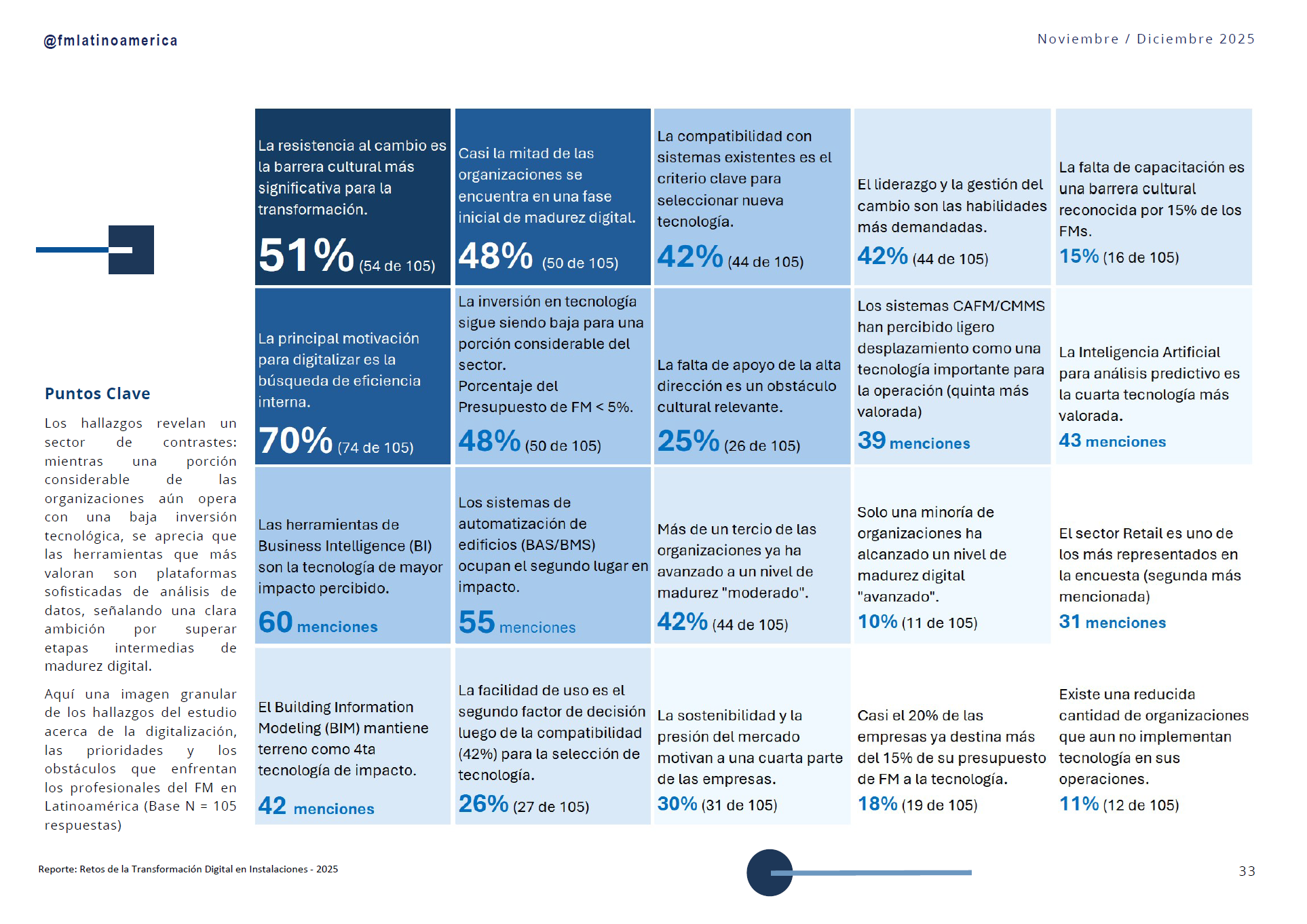 El análisis cuantitativo muestra que el FM en Latinoamérica atraviesa una transición importante, enfrentando la necesidad de optimización con la resistencia cultural al cambio. Actualmente, casi la mitad de las organizaciones tienen una baja madurez digital, lo que representa un gran potencial sin explotar. La clave no es solo invertir más, sino adoptar estrategias tecnológicas integradas y escalables, evitando soluciones puntuales que fragmenten los sistemas. El estudio destaca la creciente importancia del análisis de datos y el uso de herramientas BI, transformando al Facility Manager en un analista estratégico capaz de mejorar decisiones y experiencias.